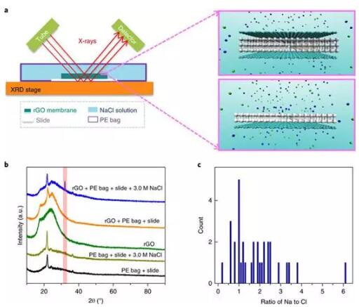 圖1 a)實(shí)驗(yàn)裝置的示意圖。B)浸入3.0 MNaCl溶液中的rGO膜的XRD圖像與四個(gè)控制系統(tǒng)的XRD圖案 C)通過EDS-TEM測定的2D晶體結(jié)構(gòu)中Na與Cl的比率。