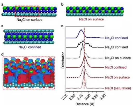圖2:DFT計(jì)算Na+和Cl-的結(jié)構(gòu)(在石墨烯表面上和兩個(gè)石墨烯片之間)a-c)Na2Cl(a)和NaCl(b)晶體分別與石墨烯片上的Na和Cl元素以2:1和1:1的比率與Na3Cl(c)d)在Na2的區(qū)域(紅色虛線)內(nèi)捕獲的分子軌道的最高占用狀態(tài)Cl晶片(a)。e)不同系統(tǒng)中粒子的徑向分布函數(shù)。每個(gè)峰顯示每個(gè)晶體結(jié)構(gòu)的最近鄰Na-Cl距離分布。